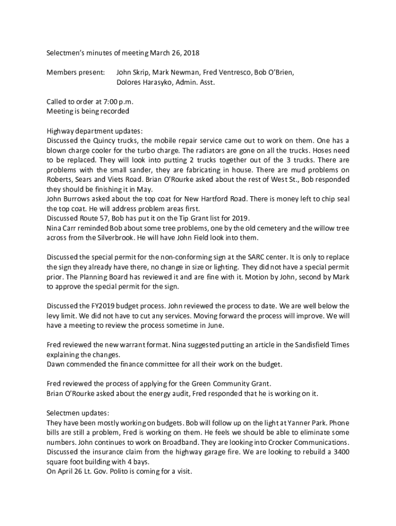 Selectman minutes of meeting March 26, 2018, Members present:John Strip, Mark Newman, Fred Ventures, Bob O'Brien, Dolores Harass, Admin. Asst. Called to order at 7:00 p.m. Meeting is being recorded