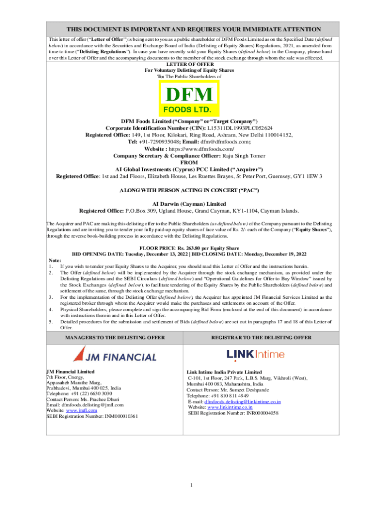 THIS DOCUMENT IS IMPORTANT AND REQUIRES YOUR IMMEDIATE ATTENTION This letter of offer (Letter of Offer) is being sent to you as a public shareholder of DFM Foods Limited as on the Specified Date (defined