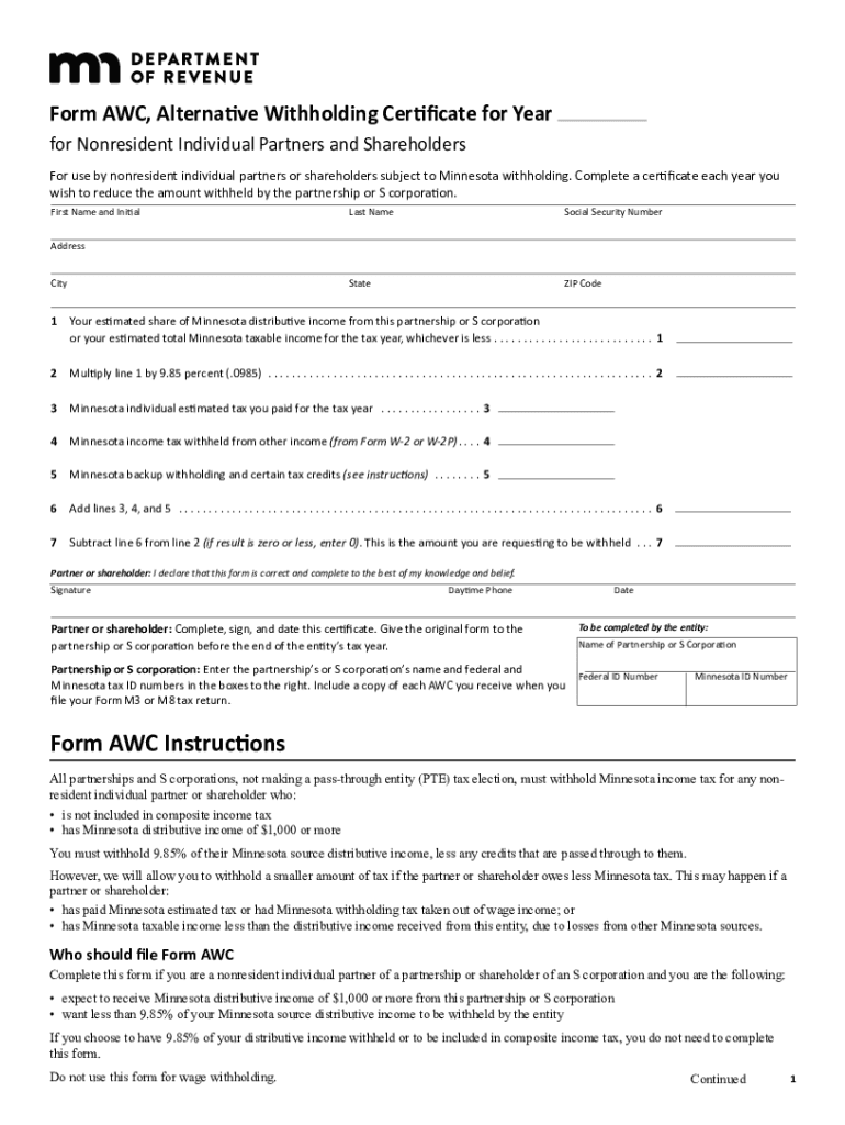 Form AWC, Alternative Withholding Certificate for Year for Nonresident Individual Partners and Shareholders For use by nonresident individual partners or shareholders subject to Minnesota withholding.