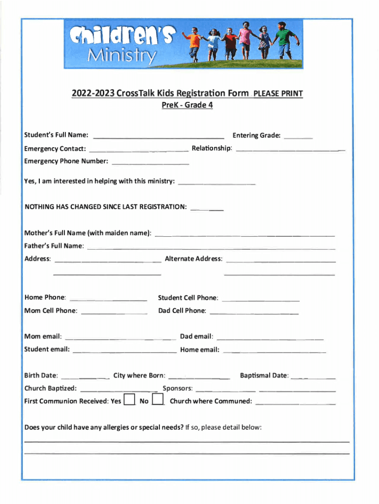 20222023 CrossTalk Kids Registration Form. PLEASE PRINT Prey Grade 4Student\'s Full Name:Entering Grade: ___Emergency Contact: ___ ___ Relationship: ___ Emergency Phone Number: ___ Yes, I am interested