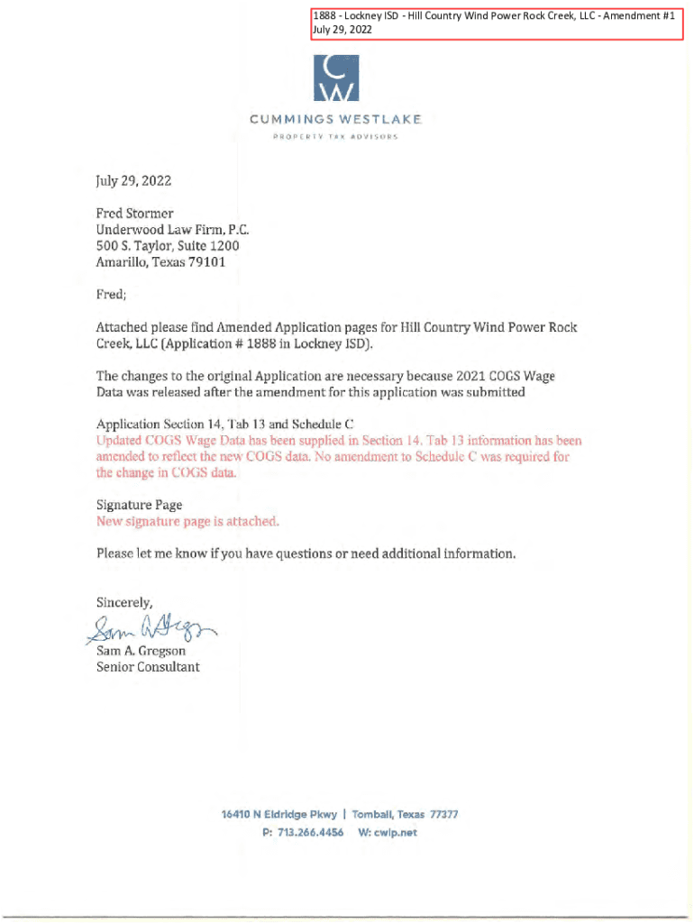 1888 Cockney ISD Hill Country Wind Power Rock Creek, LLC Amendment #1 July 29, 2022CUMMINGS WESTLAKE PROPERTYTAXADVISORSJuly 29, 2022 Fred Stormed Underwood Law Firm, P.C. 500 S. Taylor, Suite 1200