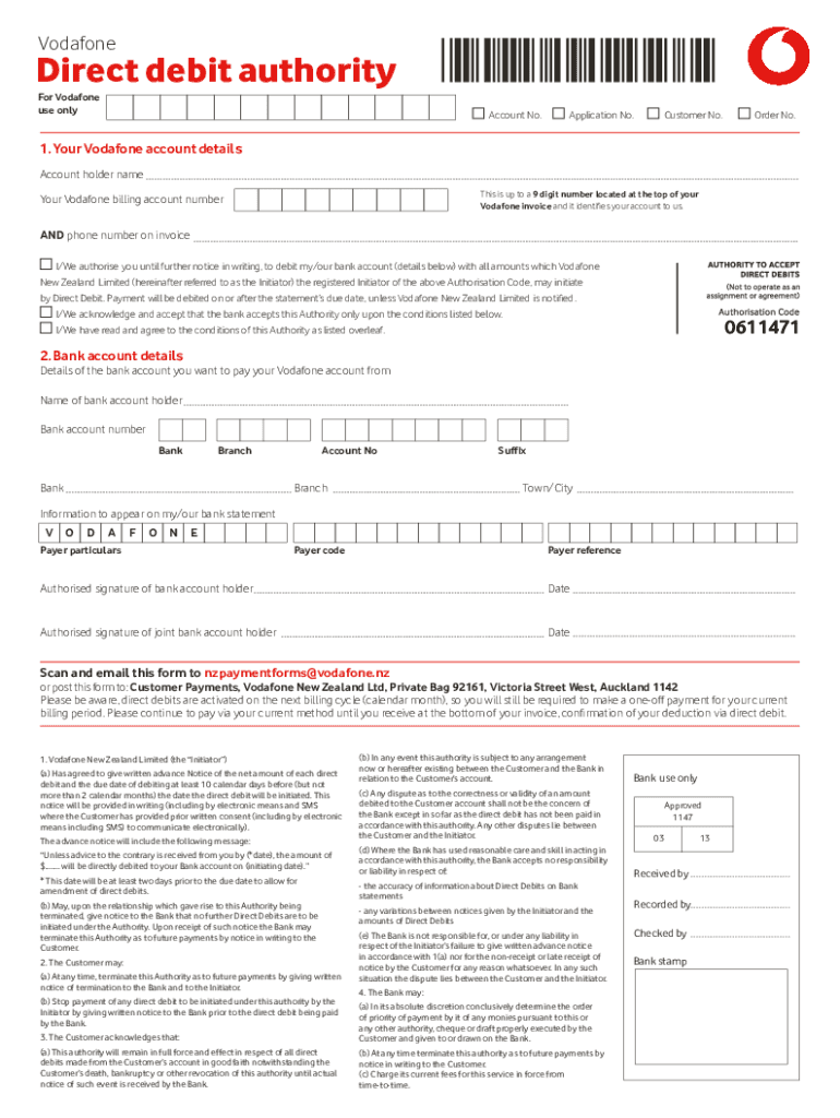 VodafoneDirect debit authority For Vodafone use onlyAccount No. Application No. Customer No. Order No.1. Your Vodafone account details Account holder name This is up to a 9-digit number located at