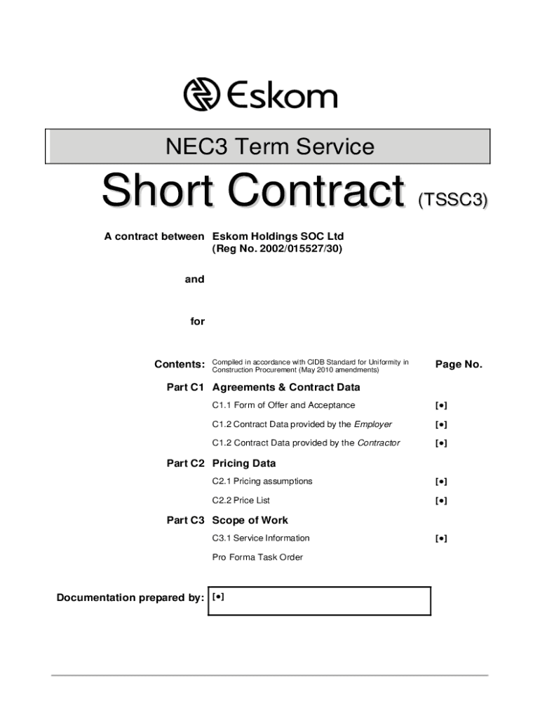 NEC3 Term Service Short Contract(TSSC3)A contract between Epsom Holdings SOC Ltd (Reg No. 2002/015527/30) andforContents:Compiled in accordance with CDB Standard for Uniformity in Construction Procurement