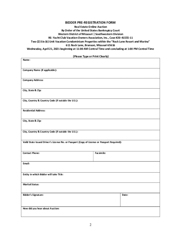 Instructions for Bidder Qualification Real Estate Online Auction By Order of the United States Bankruptcy Court Western District of Missouri | Southwestern Division RE: Yacht Club Vacation Owners