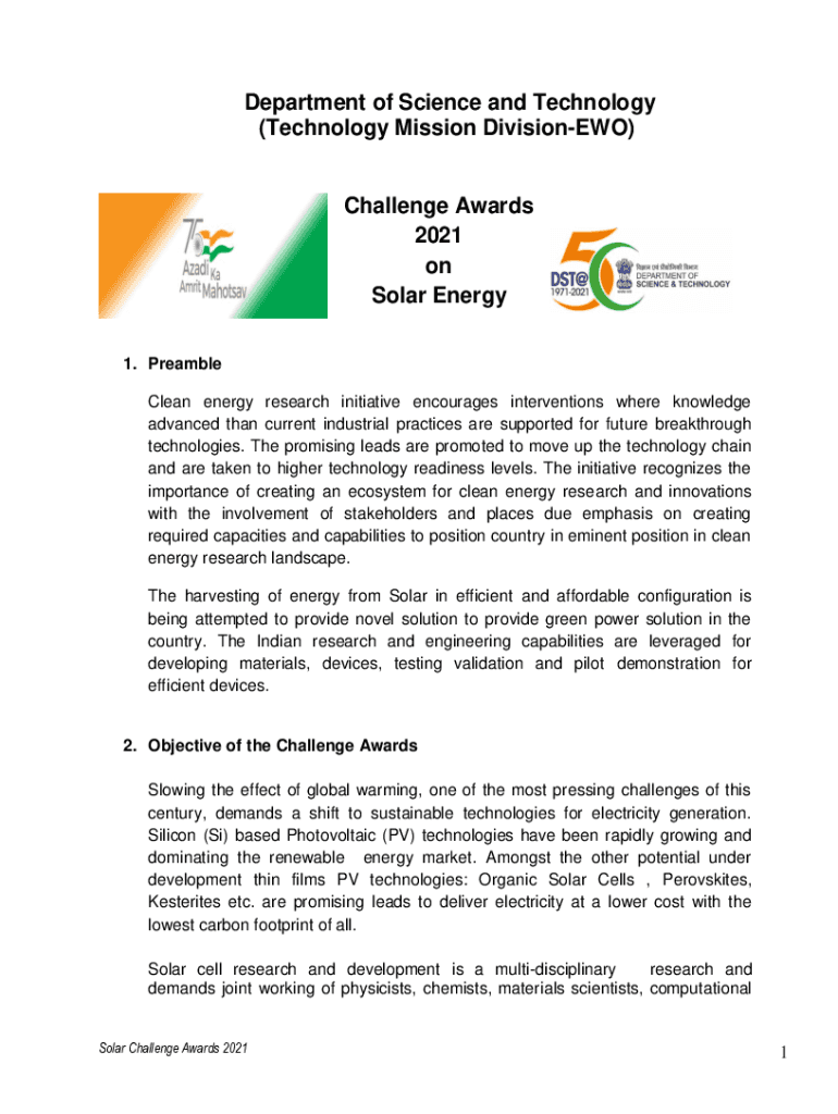 Department of Science and Technology (Technology Mission Division)Challenge Awards 2021 on Solar Energy 1. Preamble Clean energy research initiative encourages interventions where knowledge advance
