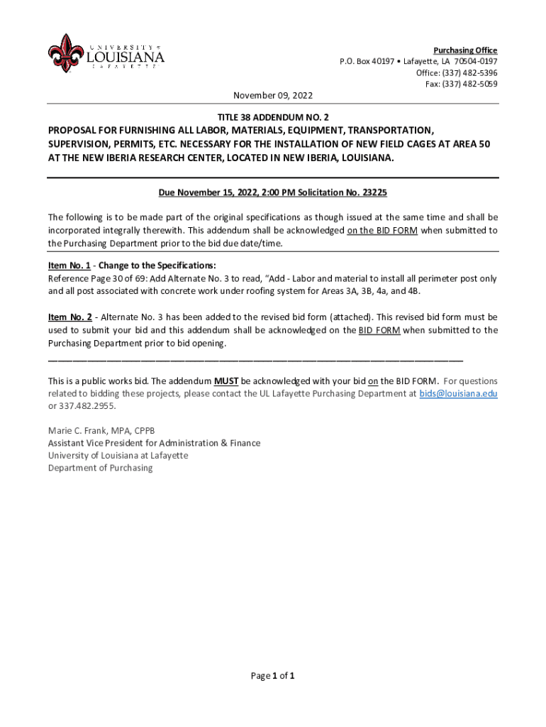 November 09, 2022Purchasing Office P.O. Box 40197 Lafayette, LA 705040197 Office: (337) 4825396 Fax: (337) 4825059TITLE 38 ADDENDUM NO. 2PROPOSAL FOR FURNISHING ALL LABOR, MATERIALS, EQUIPMENT, TRANSPORTATION,