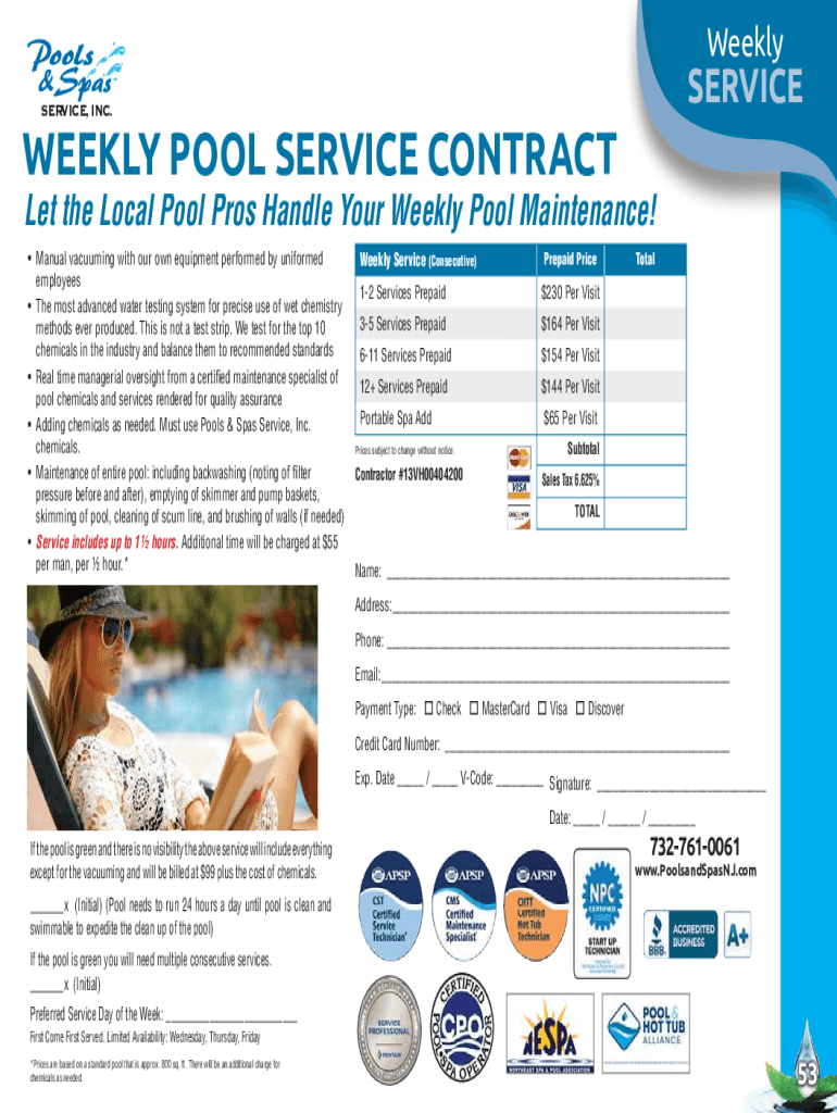 WeeklySERVICESERVICE, INC.WEEKLY POOL SERVICE Contracted the Local Pool Pros Handle Your Weekly Pool Maintenance! Manual vacuuming with our own equipment performed by uniformed Prepaid Price Total