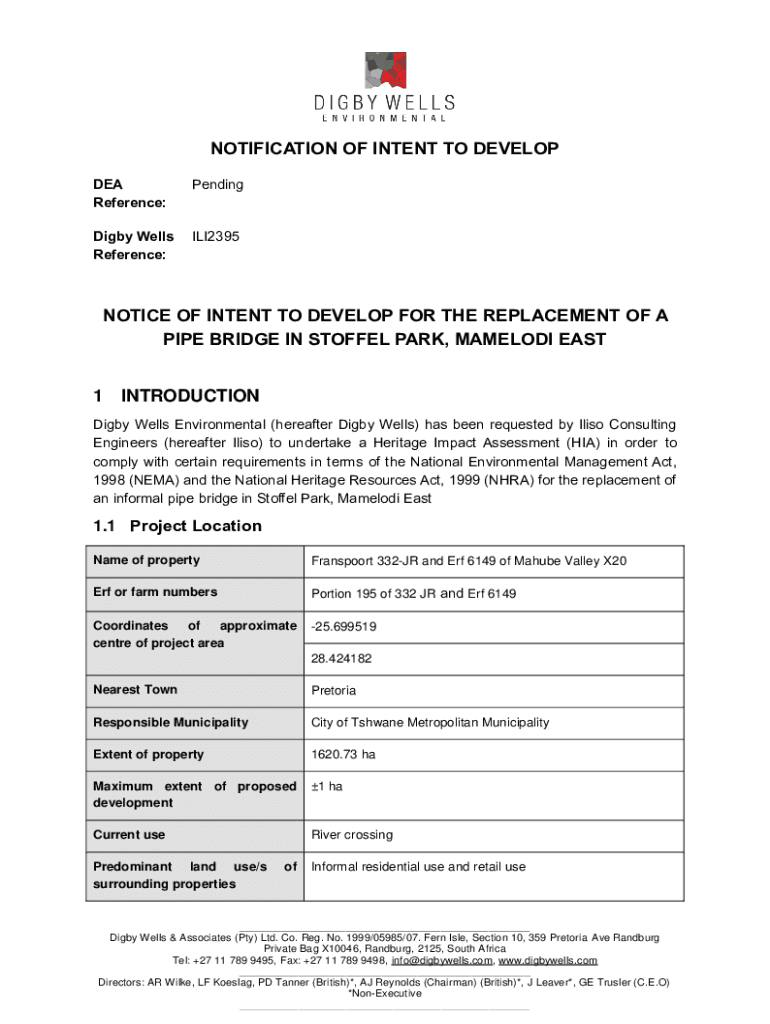 NOTIFICATION OF INTENT TO DEVELOP DEA Reference:PendingDigby Wells Reference:ILI2395NOTICE OF INTENT TO DEVELOP FOR THE REPLACEMENT OF A PIPE BRIDGE IN STAFFED PARK, MELODY EAST 1 INTRODUCTION Dig