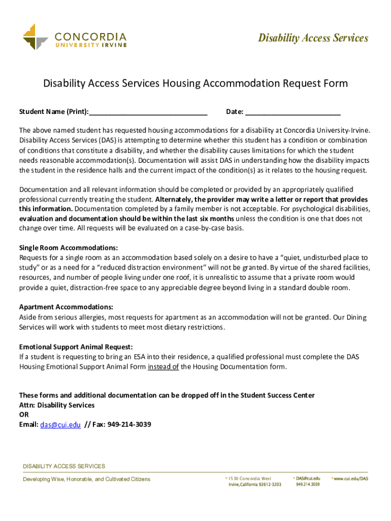 Disability Access Services Disability Access Services Housing Accommodation Request Form Student Name (Print):___Date: ___The above named student has requested housing accommodations for a disability