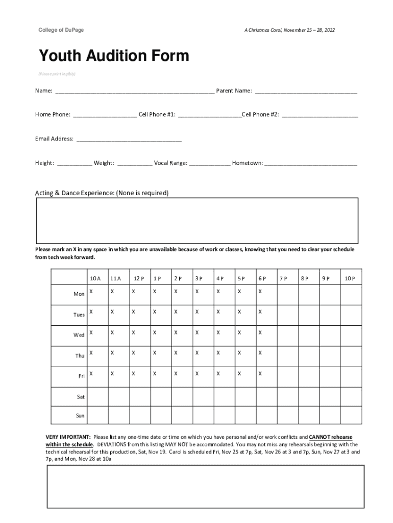 A Christmas Carol, November 25 28, 2022College of DuPageYouth Audition Form (Please print legibly)Name: ___ Parent Name: ___Home Phone: ___ Cell Phone #1: ___Cell Phone #2: ___Email Address: ___Height: