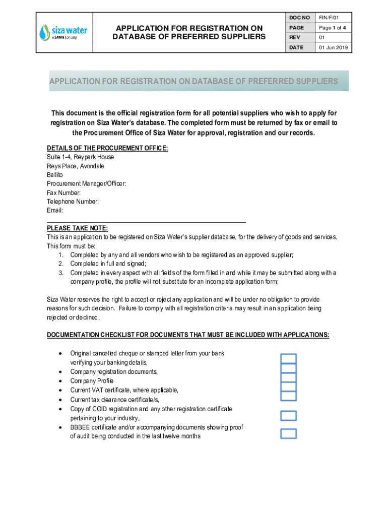APPLICATION FOR REGISTRATION ON DATABASE OF PREFERRED SUPPLIERS DOC NO FIN/F/01PAGEPage 1 of 4REV01DATE01 Jun 2019APPLICATION FOR REGISTRATION ON DATABASE OF PREFERRED SUPPLIERSThis document is the