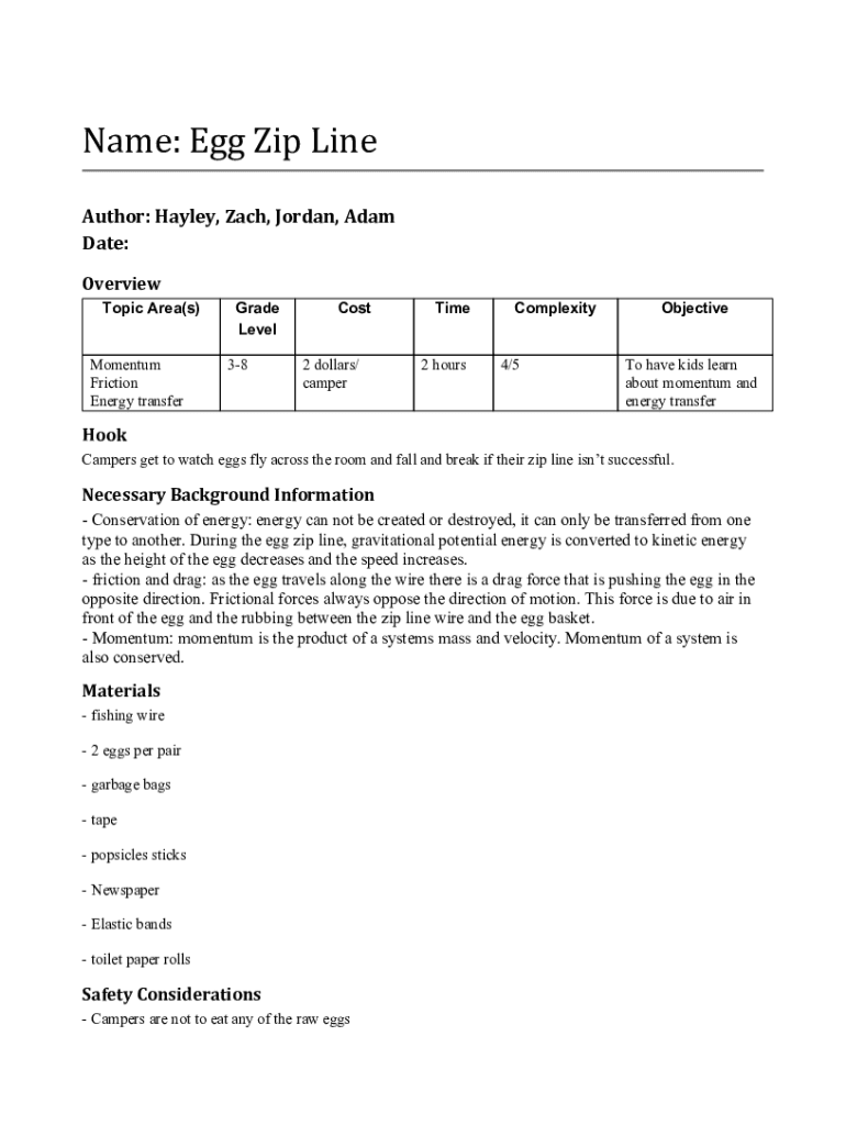 Name: Egg Zip Line Author: Hayley, Zach, Jordan, Adam Date: Overview Topic Area(s)Momentum Friction Energy transferred Level 38Cost2 dollars/ camperTime2 hoursComplexity4/5ObjectiveTo have kids learn