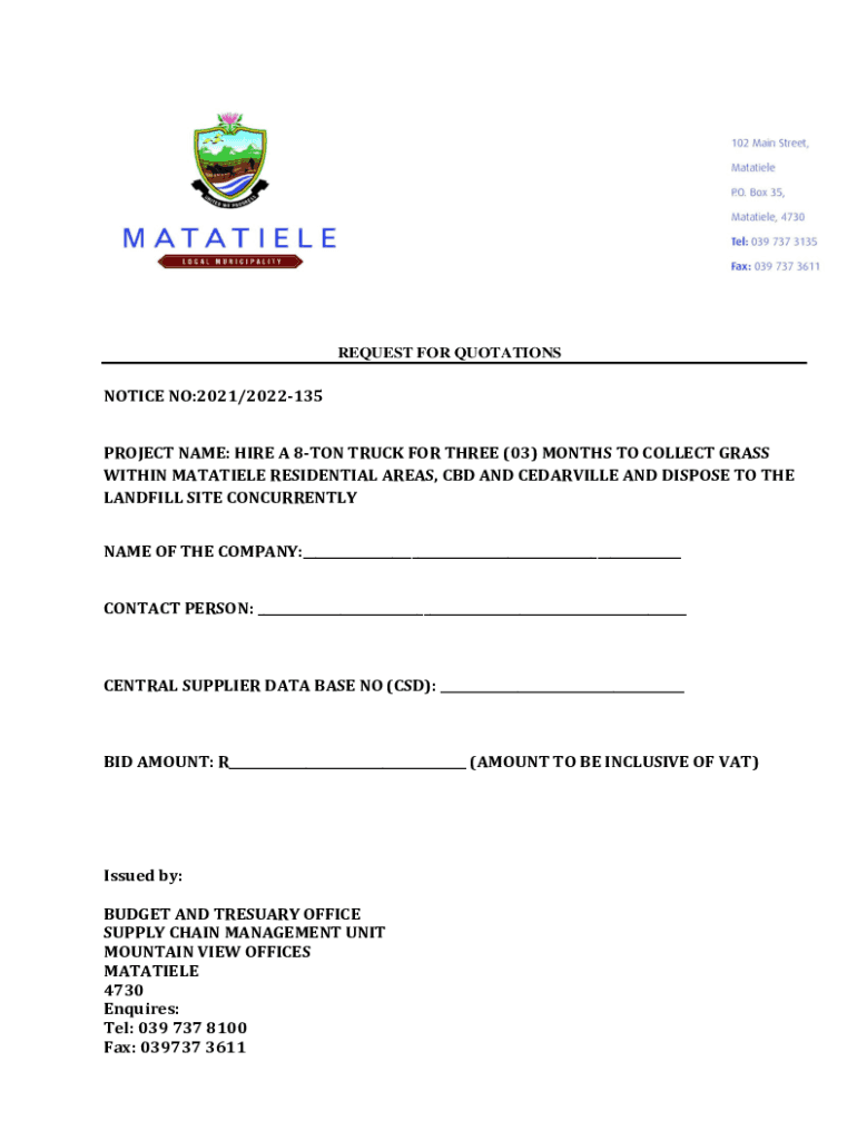 REQUEST FOR QUOTATIONSNOTICE NO:2021/2022135 PROJECT NAME: HIRE A 8TON TRUCK FOR THREE (03) MONTHS TO COLLECT GRASS WITHIN MATERIEL RESIDENTIAL AREAS, CBD AND DANVILLE AND DISPOSE TO THE LANDFILL