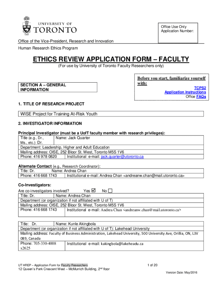 Office Use Only Application Number:Office of the VicePresident, Research and Innovation Human Research Ethics ProgramETHICS REVIEW APPLICATION FORM FACULTY (For use by University of Toronto Faculty