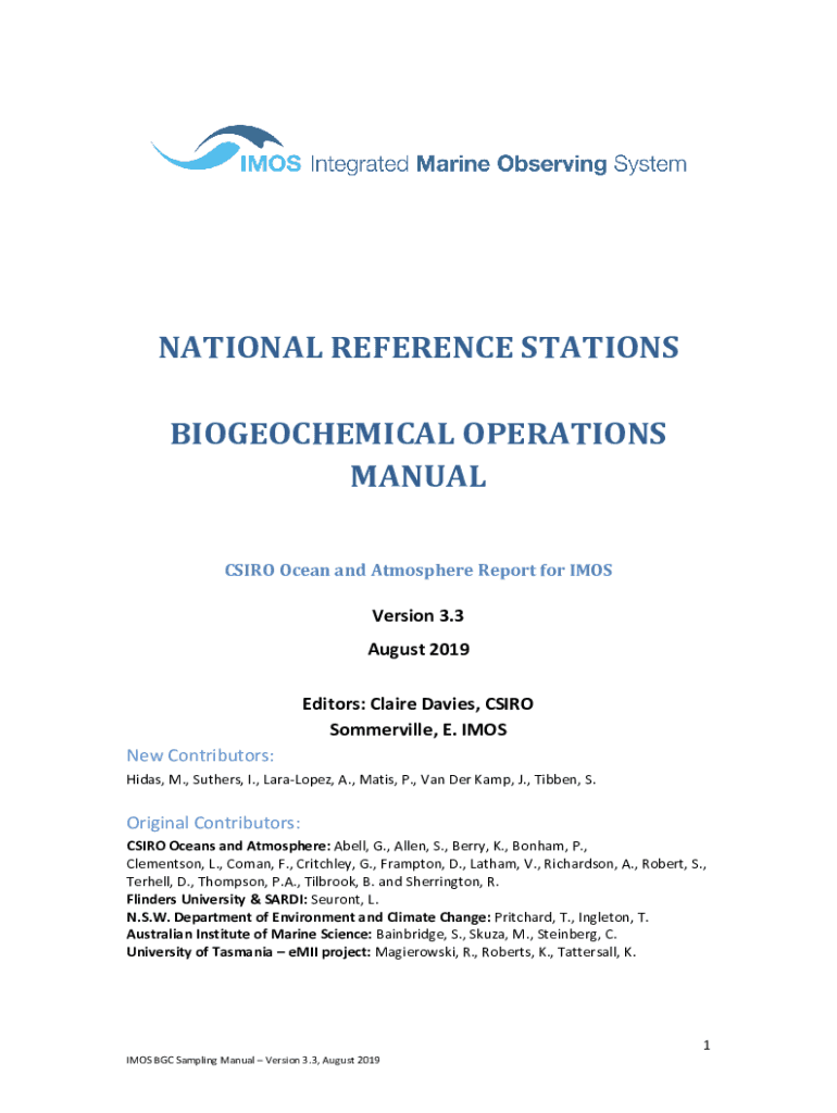 NATIONAL REFERENCE STATIONS BIOGEOCHEMICAL OPERATIONS MANUAL CAIRO Ocean and Atmosphere Report for Conversion 3.3 August 2019 Editors: Claire Davies, CAIRO Somerville, E. AMOS New Contributors: Hides,