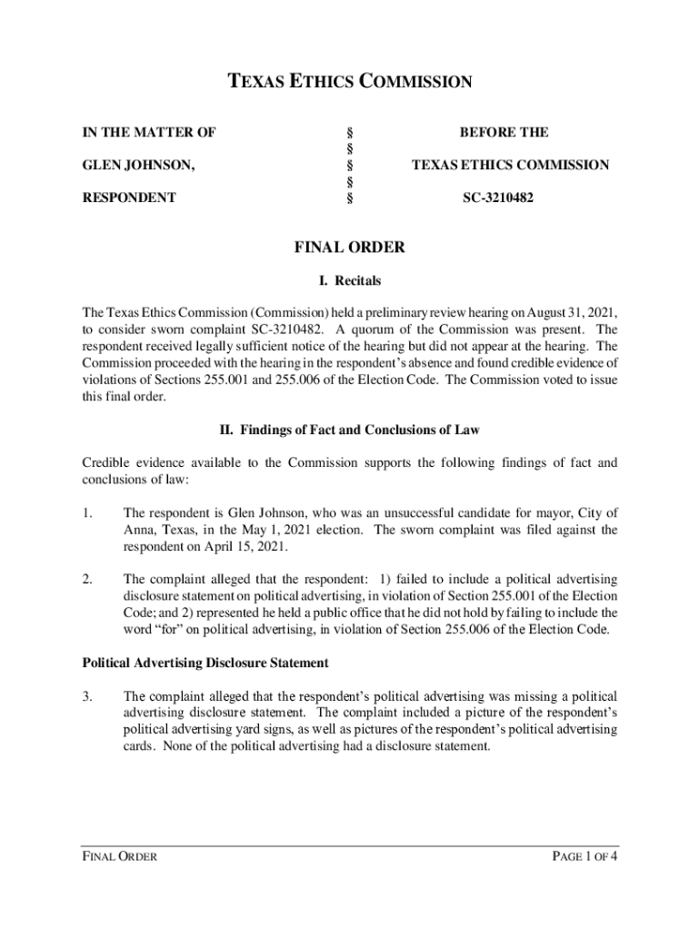 TEXAS ETHICS COMMISSION IN THE MATTER OF GLEN JOHNSON, RESPONDENTBEFORE THE TEXAS ETHICS COMMISSION SC3210482FINAL ORDER I. Recitals The Texas Ethics Commission (Commission) held a preliminary review