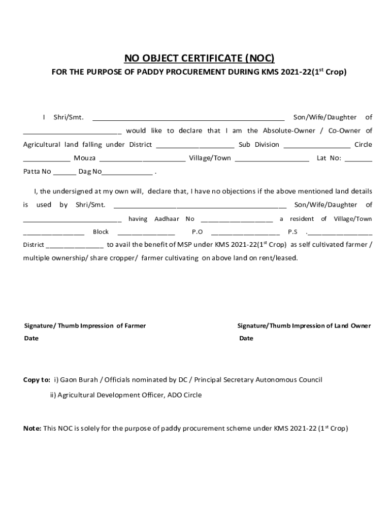 NO OBJECT CERTIFICATE (NOC) FOR THE PURPOSE OF PADDY PROCUREMENT DURING KMS 202122 (1st Crop)Tishri/SMT.___Son/Wife/Daughter of___ would like to declare that I am the AbsoluteOwner / Corner of Agricultural