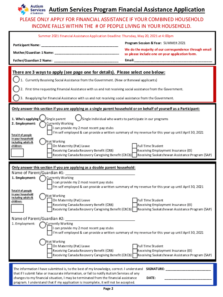 Autism Services Program Financial Assistance Application PLEASE READ THIS INFORMATION CAREFULLY BEFORE STARTING YOUR APPLICATION: We will accept all completed Financial Assistance applications for