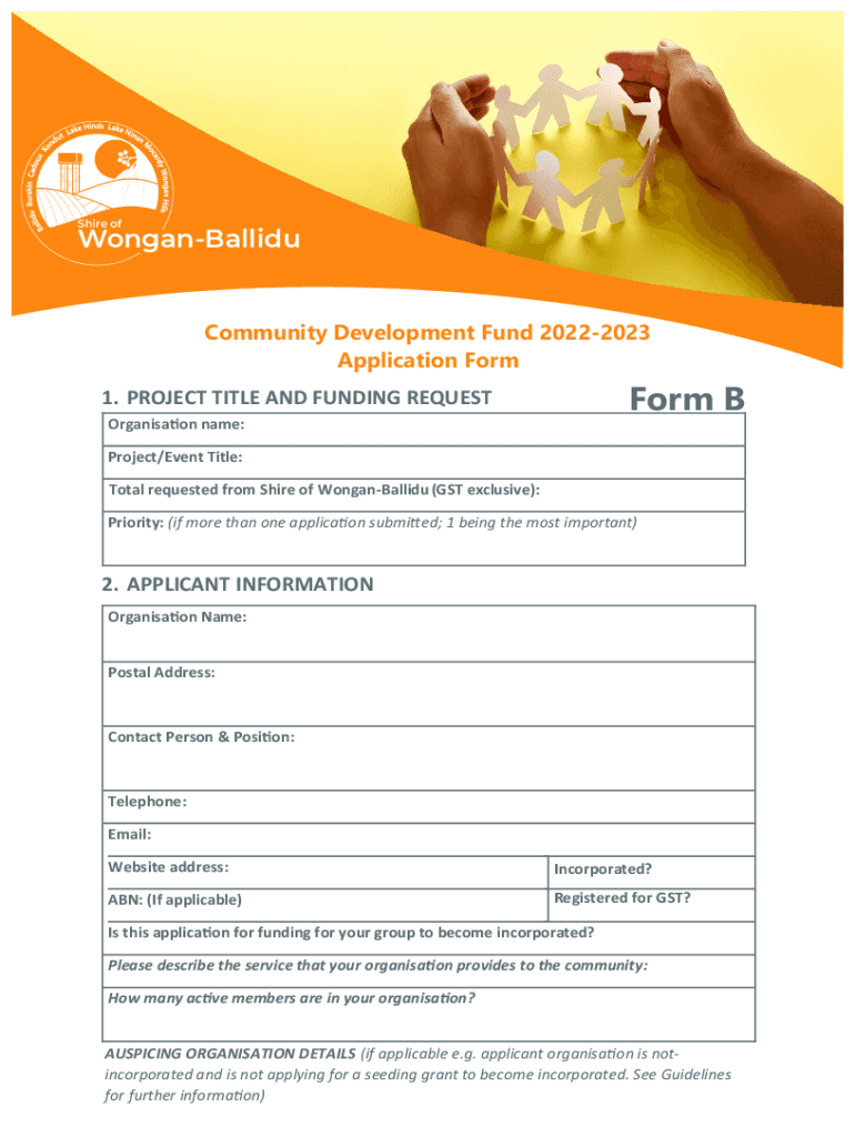 Shire ofWonganBalliduCommunity Development Fund 20222023 Application Former B1. PROJECT TITLE AND FUNDING REQUEST Organism on name: Project/Event Title: Total requested from Shire of WonganBallidu