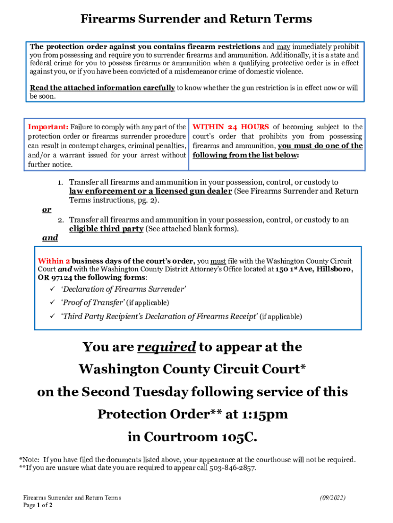 Firearms Surrender and Return Terms The protection order against you contains firearm restrictions and may immediately prohibit you from possessing and require you to surrender firearms and ammunition.