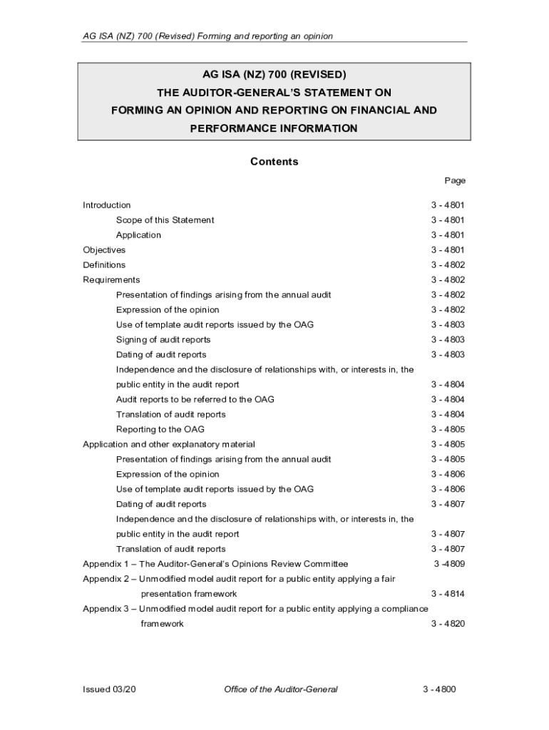 AG ISA (NZ) 700 (Revised) Forming and reporting an opinion AG ISA (NZ) 700 (REVISED) THE AUDITORGENERALS STATEMENT ON FORMING AN OPINION AND REPORTING ON FINANCIAL AND PERFORMANCE INFORMATION Contents