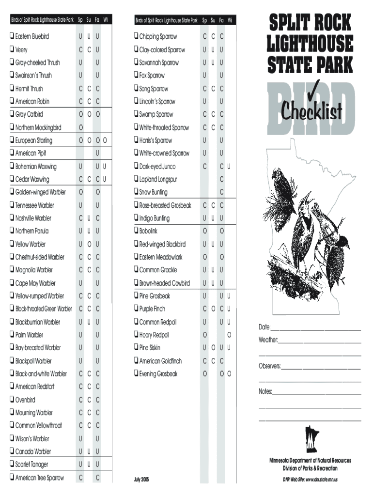 Get the free Split Rock Lighthouse State Park bird checklist - files - files dnr state mn
