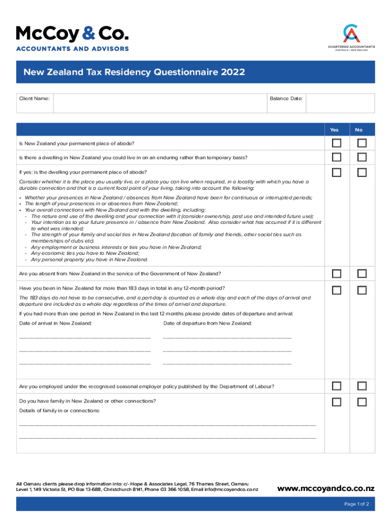 New Zealand Tax Residency Questionnaire 2022 Client Name:Balance Date:Tennis New Zealand your permanent place of abode? Is there a dwelling in New Zealand you could live in on an enduring rather than