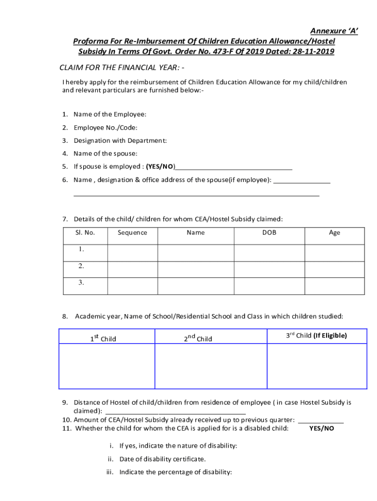 Appendix A Proforma For Reimbursement Of Children Education Allowance/Hostel Subsidy In Terms Of Govt. Order No. 473F Of 2019 Dated: 28112019 CLAIM FOR THE FINANCIAL YEAR: I hereby apply for the reimbursement