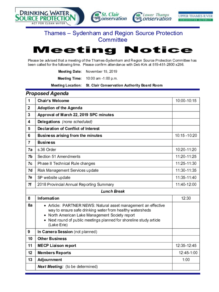 Please be advised that a meeting of the ThamesSydenham and Region Source Protection Committee has