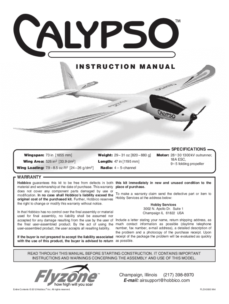 Customers who purchase the Hobbico Calypso product are required to file the instruction manual.