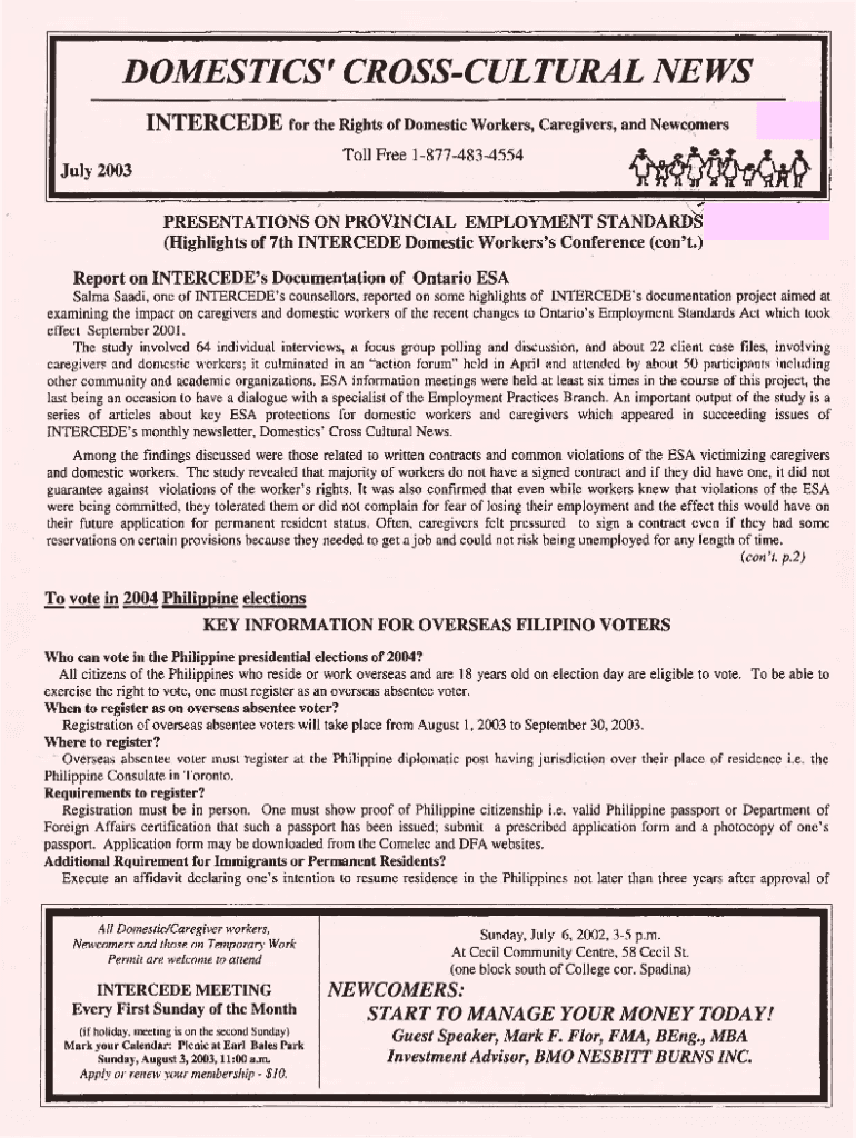 DOMESTICS\' TRANSCULTURAL NEWS INTERCEDE for the Rights of Domestic Workers, Caregivers, and Newcomers Toll Free 18774834554July 2003, \'PRESENTATIONS ON PROVINCIAL EMPLOYMENT Standard\'S’t; (Highlights