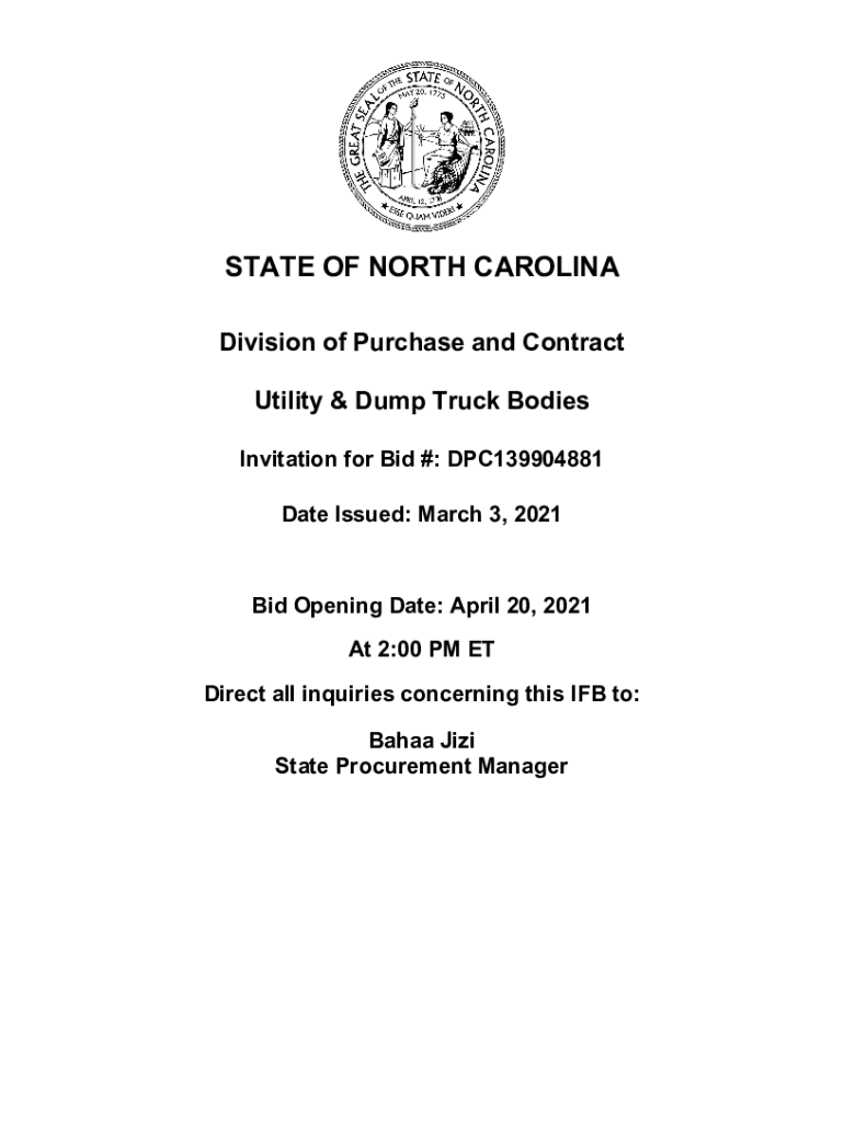 STATE OF NORTH CAROLINA Division of Purchase and Contract Utility & Dump Truck Bodies Invitation for Bid #: DPC139904881 Date Issued: March 3, 2021Bid Opening Date: April 20, 2021, At 2:00 PM ET Direct