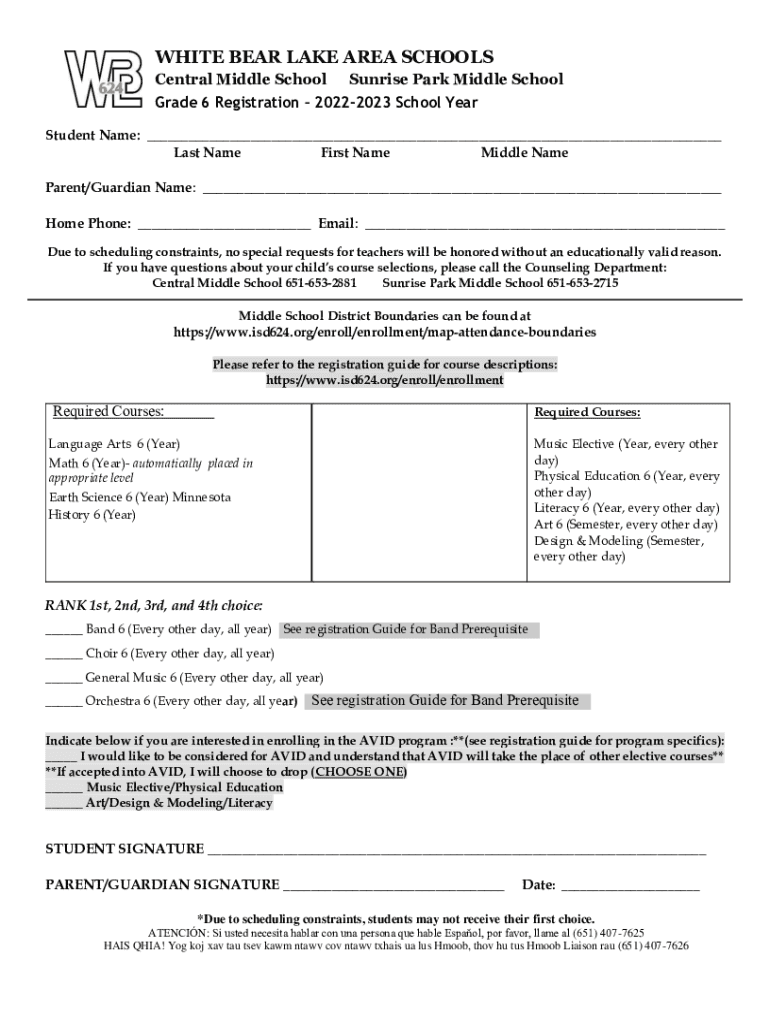 WHITE BEAR LAKE AREA SCHOOLS Central Middle School Sunrise Park Middle School Grade 6 Registration 20222023 School Year Student Name: ___ Last Name First Name Middle Name Parent/Guardian Name: ___