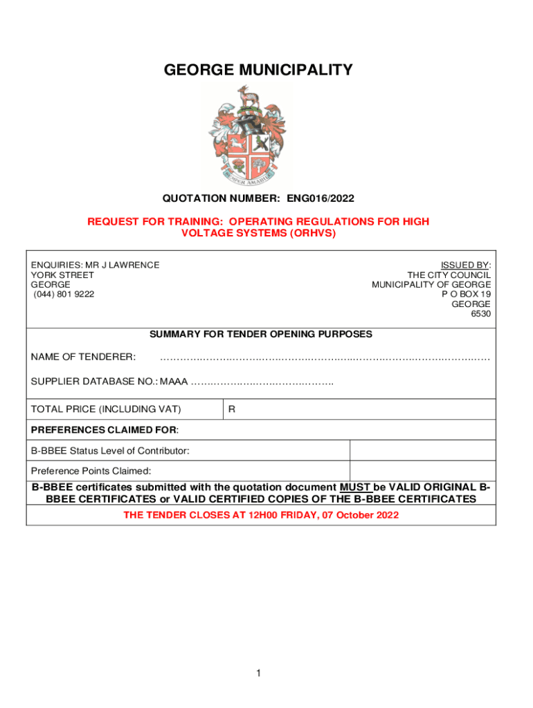 GEORGE MUNICIPALITYQUOTATION NUMBER: ENG016/2022 REQUEST FOR TRAINING: OPERATING REGULATIONS FOR HIGH VOLTAGE SYSTEMS (ORES) Inquiries: MR J LAWRENCE YORK STREET GEORGE (044) 801 9222ISSUED BY: THE