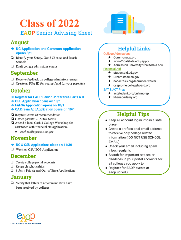 Class of 2022EAOP Senior Advising Sheet August UC Application and Common Application opens 8/1 Identify your Safety, Good Chance, and Reach Schools Draft college admissions essays September Receive