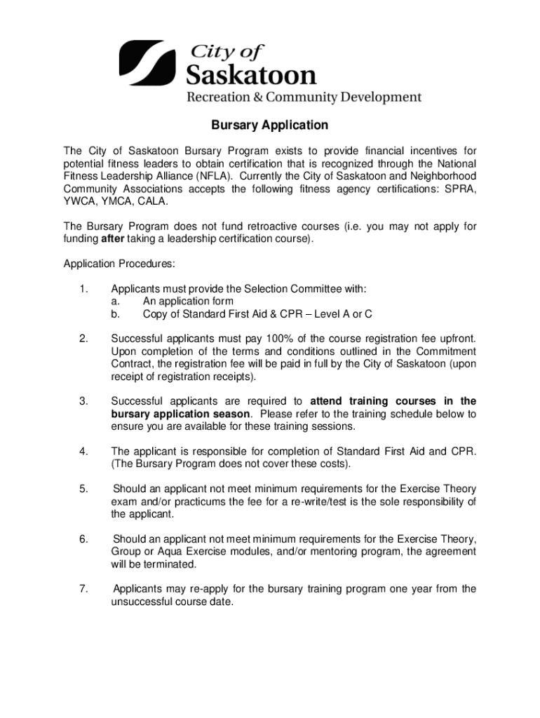 Bursary Application The City of Saskatoon Bursary Program exists to provide financial incentives for potential fitness leaders to obtain certification that is recognized through the National Fitness