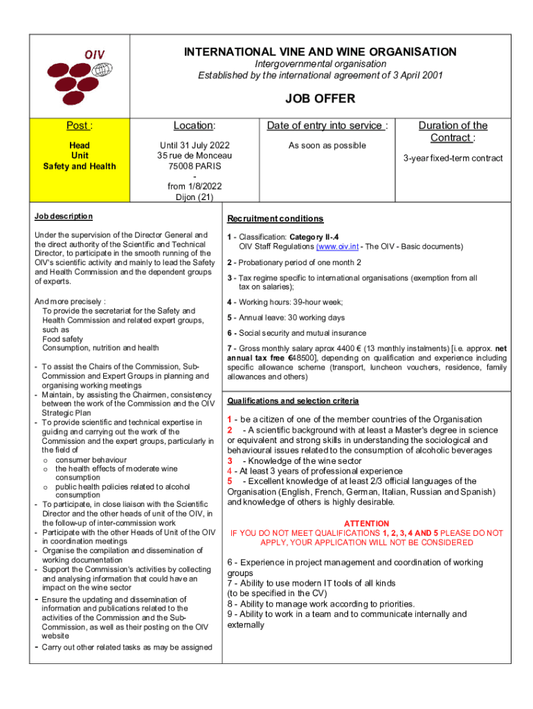 INTERNATIONAL VINE AND WINE Organization Intergovernmental organization Established by the international agreement of 3 April 2001JOB OFFER Post :Location:Date of entry into service :Head Unit Safety