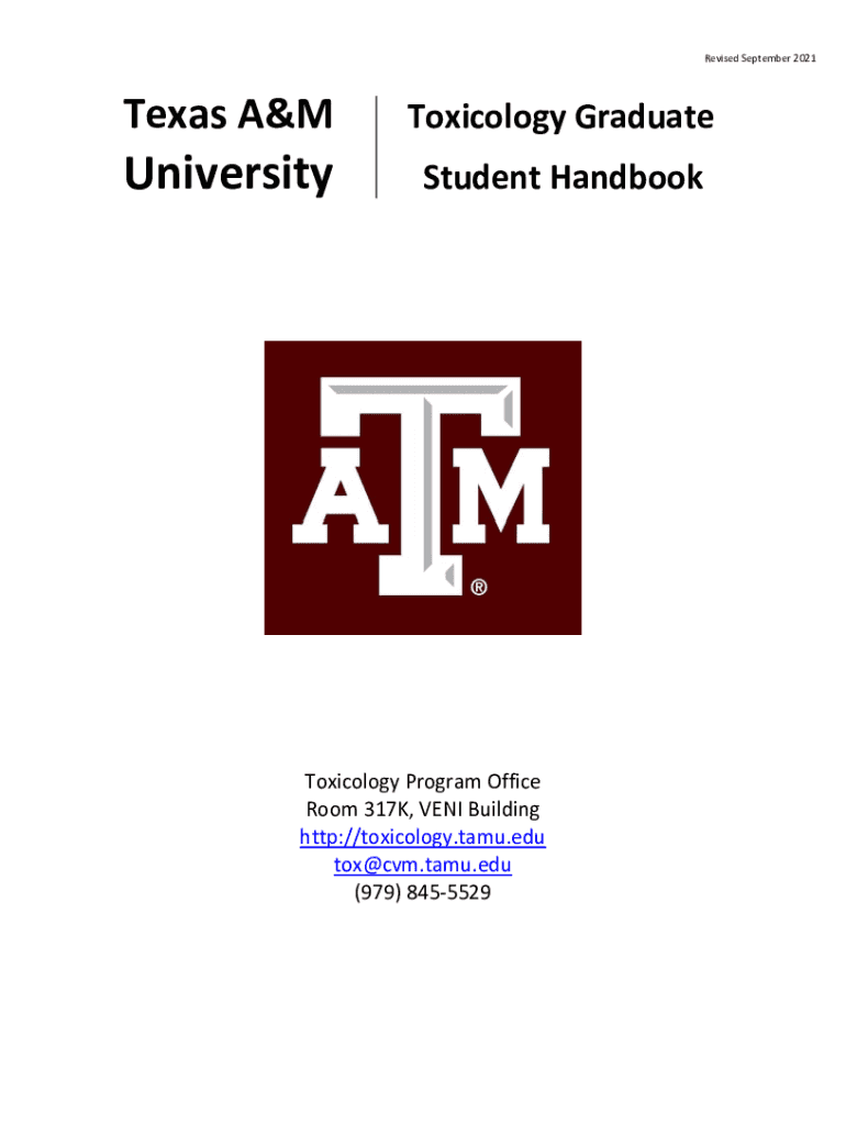 Revised September 2021Texas A&MUniversityToxicology Graduate Student HandbookToxicology Program Office Room 317K, VENT Building http://toxicology.tamu.edu tox@cvm.tamu.edu (979) 8455529Revised September