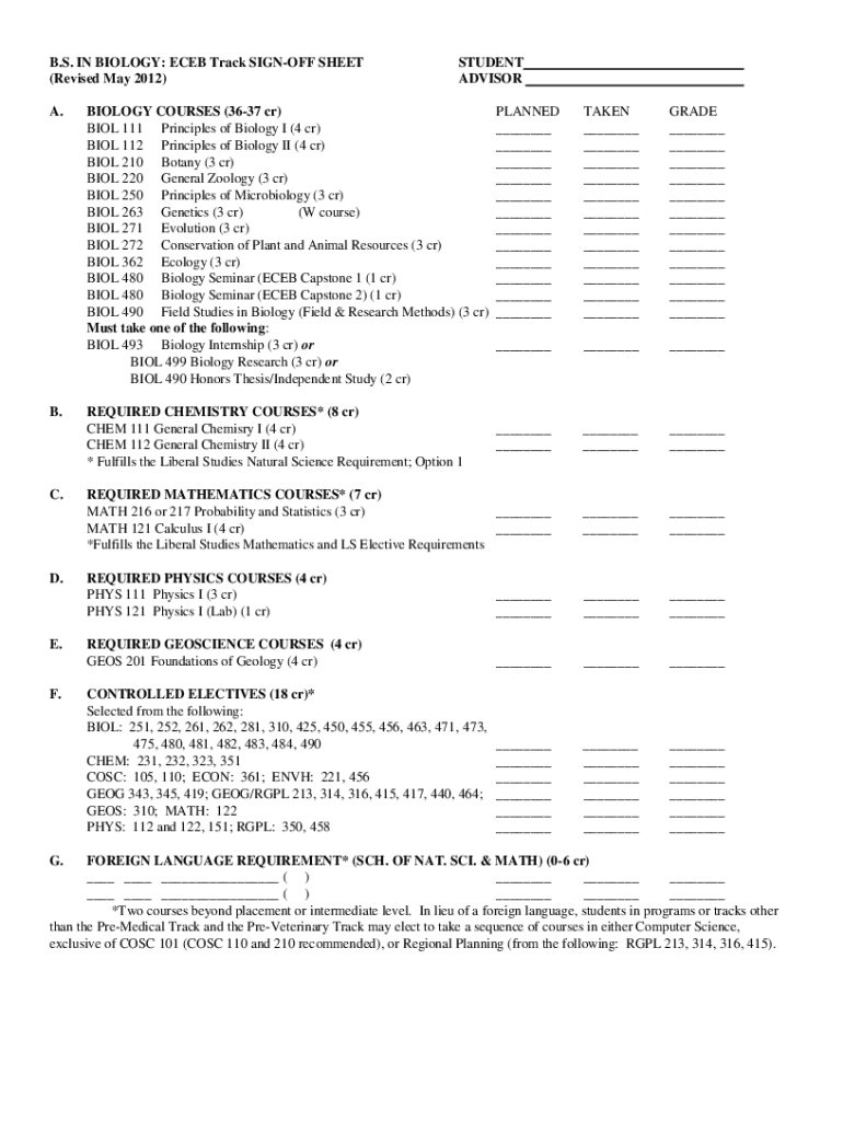 B.S. IN BIOLOGY: CEB Track SIGN-OFF SHEET (Revised May 2012) A.B.C.D.E.F.G.STUDENT ADVISORBIOLOGY COURSES (3637 CR) BIOL 111 Principles of Biology I (4 CR) BIOL 112 Principles of Biology II (4 CR)