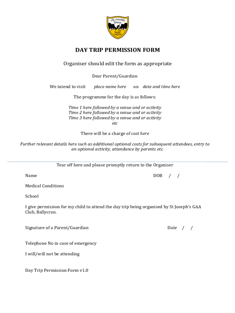 DAY TRIP PERMISSION FORMOrganiser should edit the form as appropriated Parent/Guardian intend to visit place name hereon date and time hearth program for the day is as follows:Time 1 here followed