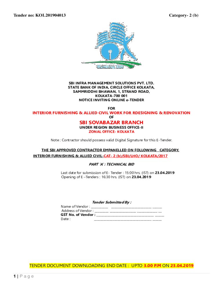 Tender no: KOL201904013Category 2 (b)SBI INFRA MANAGEMENT SOLUTIONS PVT. LTD. STATE BANK OF INDIA, CIRCLE OFFICE KOLKATA, SAMMRIDDHI SHAWN, 1, STRAND ROAD, KOLKATA700 001 NOTICE INVITING ONLINE tender
