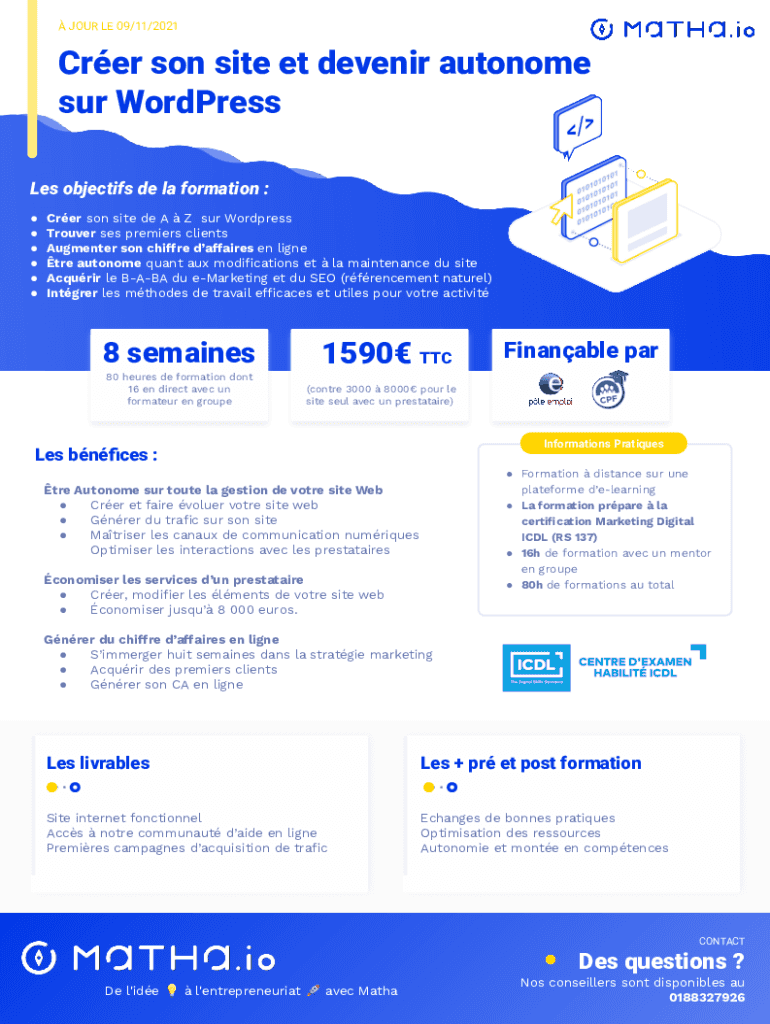 FOUR LE 09/11/2021Crer son site ET evener autonomy SUR WordPress Les objectify DE la formation : Crew son site DE A Z SUR WordPress Trouser SES premiers clients Augmenter son chiffon affairs en line