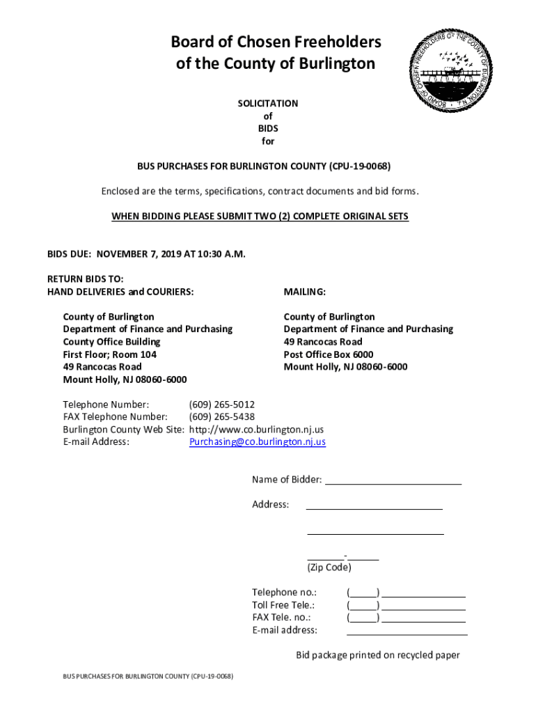 Board of Chosen Freeholders of the County of Burlington SOLICITATION of BIDS for BUS PURCHASES FOR BURLINGTON COUNTY (CPU190068) Enclosed are the terms, specifications, contract documents and bid