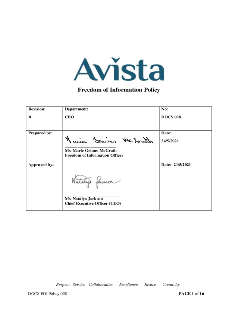 Freedom of Information PolicyRevision:Department:No:CODECS 028Prepared by:Date: 24/5/2021 ___ Ms. Marie Grimes McGrath Freedom of Information OfficerApproved by:Date: 24/5/2021___ Ms. Natalya Jackson
