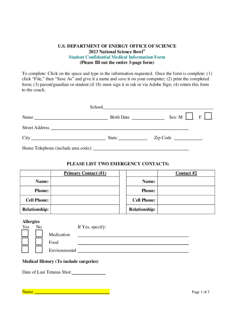 U.S. DEPARTMENT OF ENERGY OFFICE OF SCIENCE 2023 National Science Bowl Student Confidential Medical Information Form (Please fill out the entire 3page form) To complete: Click on the space and type
