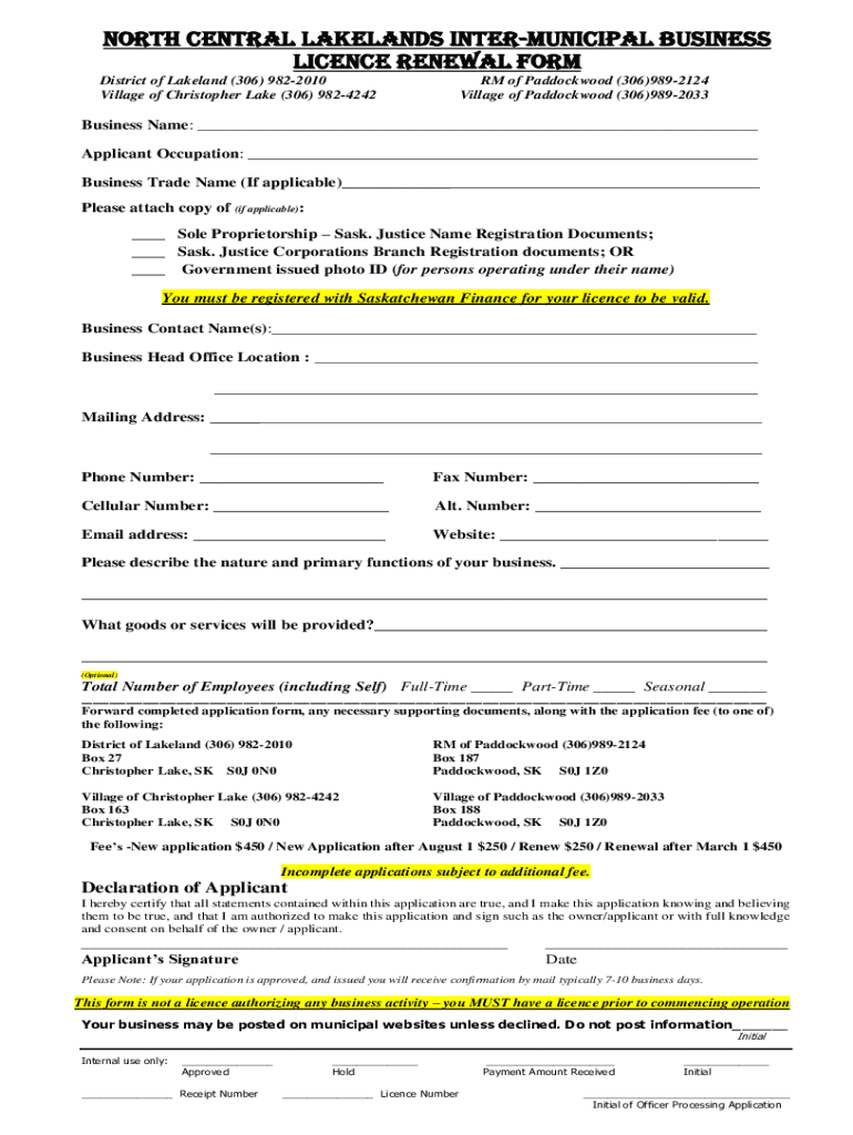 NORTH CENTRAL LAKELAND INTERMUNICIPAL BUSINESS License renewal Form District of Lakeland (306) 9822010 Village of Christopher Lake (306) 9824242RM of Paddock wood (306)9892124 Village of Paddock wood