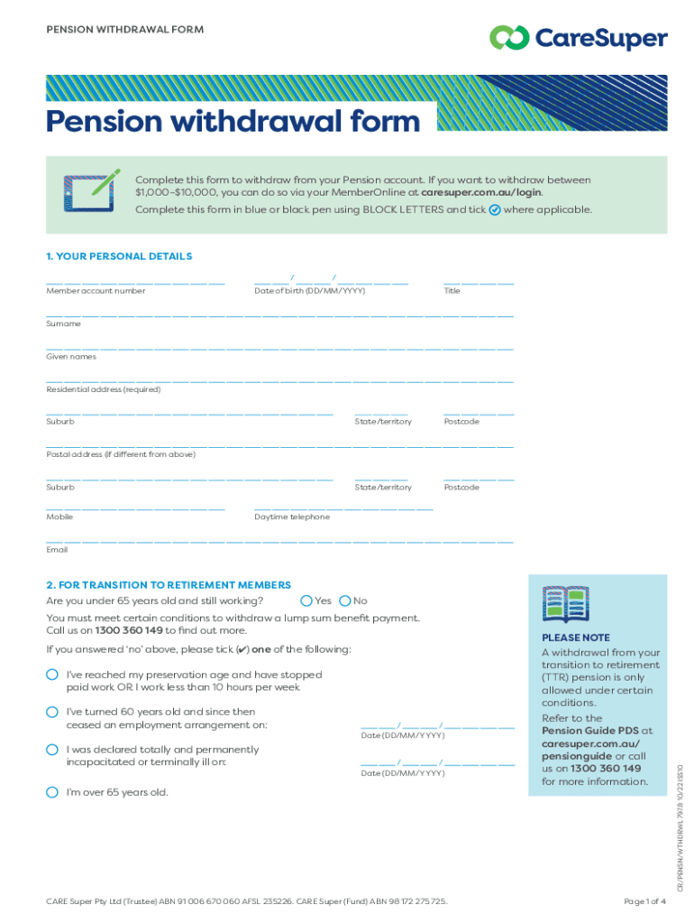 PENSION WITHDRAWAL Foreperson withdrawal form Complete this form to withdraw from your Pension account. If you want to withdraw between $$1,00010,000, you can do so via your MemberOnline at caresuper.com.au/login.