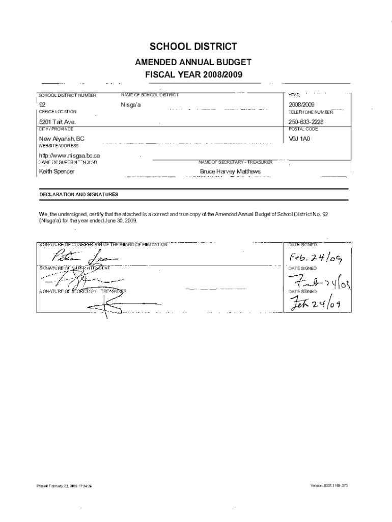 SCHOOL DISTRICT AMENDED ANNUAL BUDGET FISCAL YEAR 200812009 ! SCHOOL DISTRICT NUMBERI1 92, OFFICE LOCATIONAL OF SCHOOL DISTRICTNisga\'a ....\'Lear 2008/2009TELEPHONE NUMBER5201 Tai! Ave.2506332228CITY