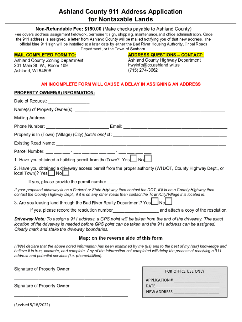 Ashland County 911 Address Application for Nontaxable Lands ___ NonRefundable Fee: $150.00 (Make checks payable to Ashland County)Fee covers address assignment fieldwork, permanent sign, shipping,