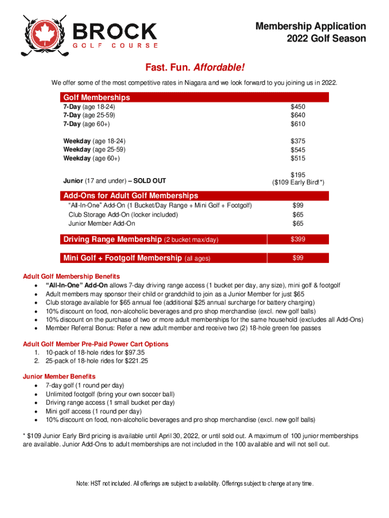 Membership Application 2022 Golf Season Fast. Fun. Affordable! We offer some of the most competitive rates in Niagara, and we look forward to you joining us in 2022. Golf Memberships 7Day (age 1824)
